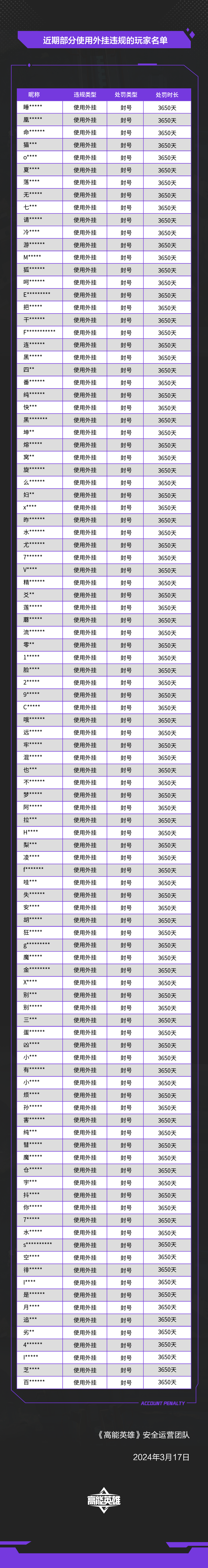 大家好,我是《高能英雄》安全大使罗杰斯,我们致力于营造公平公正的游戏环境,让每位玩家都能充分享受到游戏的乐趣。我们时刻关注外挂、第三方注入插件、恶意修改网络配置、篡改客户端等违规行为对游戏平衡性的危害,并持续更新安全策略。我们对外挂采取“零容忍”态度,一旦检测到使用外挂、修改客户端等作弊行为,将予以最严厉处罚,一律封号3650天(详见《高能英雄》玩家安全公约)。