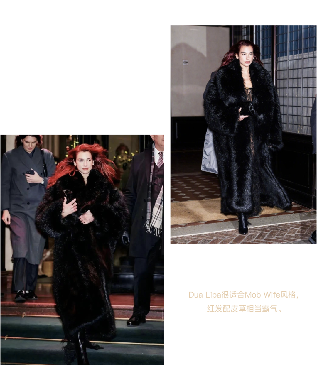 一般来讲,“Mob Wife”的造型都梳着浮夸风格的发型,搭配凌厉的妆容,立体的轮廓修容,干净利落的眉毛线条、闪亮的眼妆、带有烟熏感的不羁风范,和那毫不掩饰的气势红唇。她们还会选择分量感十足的豹纹、皮草大衣,和一款女王气场的亮面皮靴和华丽的首饰,来打造全身的视觉焦点。