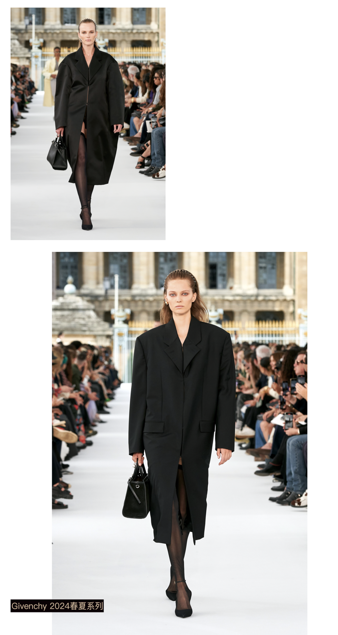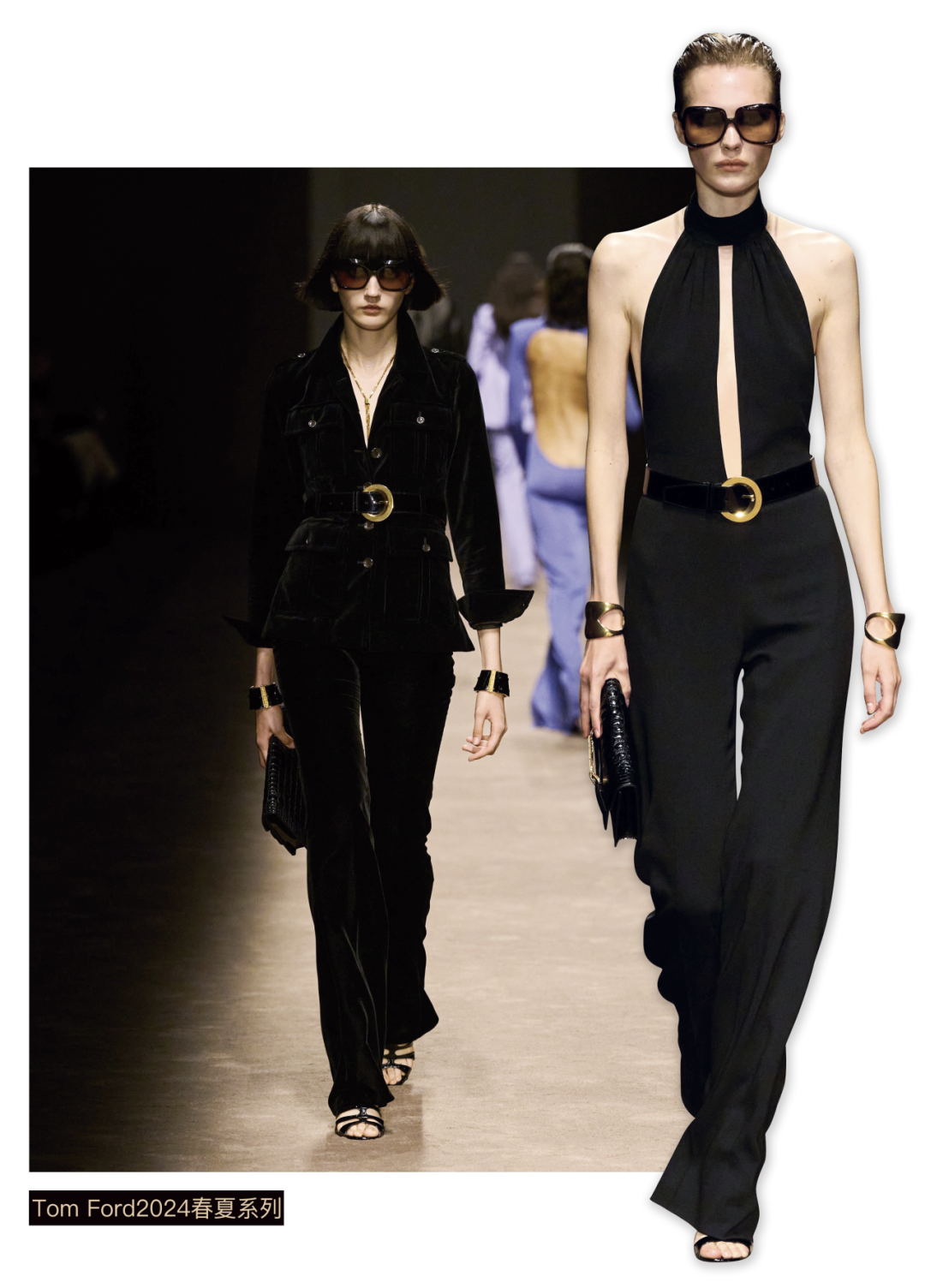 Givenchy 2024春夏系列对轻盈的薄纱偏爱有加,时而跳跃于裙摆之上,时而游荡于胸口。黑色廓形外套与黑色丝袜、尖头鞋相呼应,既有大女主的气场,又有女性的柔韧在其中。Tom Ford 2024春夏系列在延续中翻开了新的一页,以另外一种视角审视品牌自建立之初所坚持的理念,秀场妆容呼应了上世纪席卷时尚圈的猫魅性感风潮,光彩夺目,却又近似裸妆,干净的底妆凸显出了每个人的轮廓结构特点。在风格上也秉持中性风格,考究得体的西装,搭配超短裤、皮革迷你裙等单品,完美地展现女性的诱人之姿。