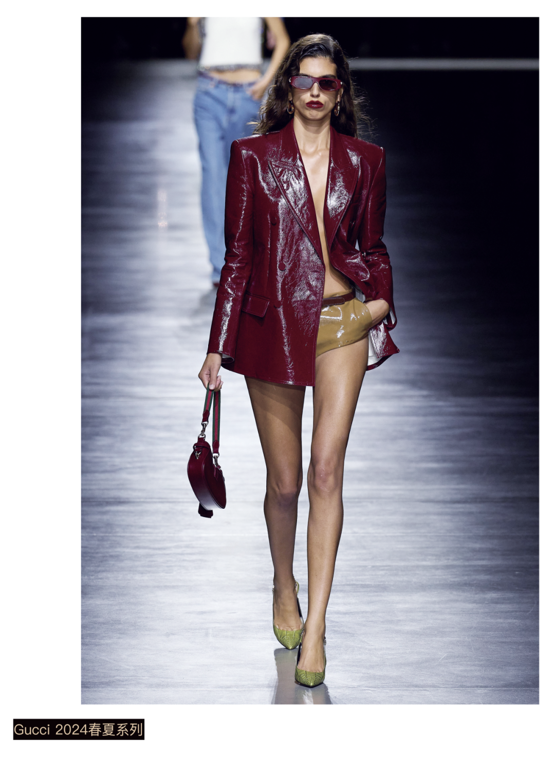 从Gucci 2024献上春夏系列来看,他显然走的是去繁从简之路,并希望延续Gucci美学历史中所塑造的性感基因。从薄纱与皮革拼接制成的V领连衣短裙下摆处,可以看到同色内衬短裤;经典的马衔扣乐福鞋则衍生出了厚底版本,分量感的颈饰打破了服装的正式感。