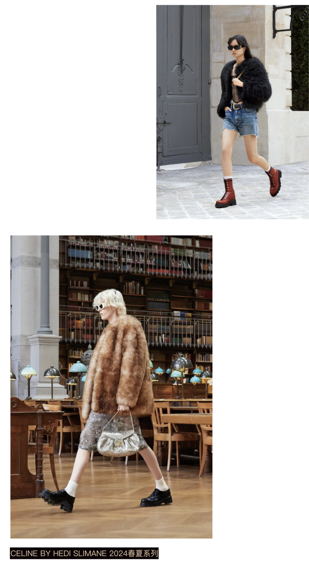皮草大衣、镂空蕾丝内搭的组合,气场和性感兼备,是最有辨识度的造型,尖头细高跟鞋作为大女人必备的时髦利器,搭配起来无疑是“Mob Wife”的最佳良配。Celine 2024 春夏女装系列设计总监Hedi Slimane以“TomBoy”作为主题,抢眼的毛绒外套搭配亮片短裙。性感酷女孩与“雌雄同体”的风格探索,向来是Hedi Slimane的拿手戏法。