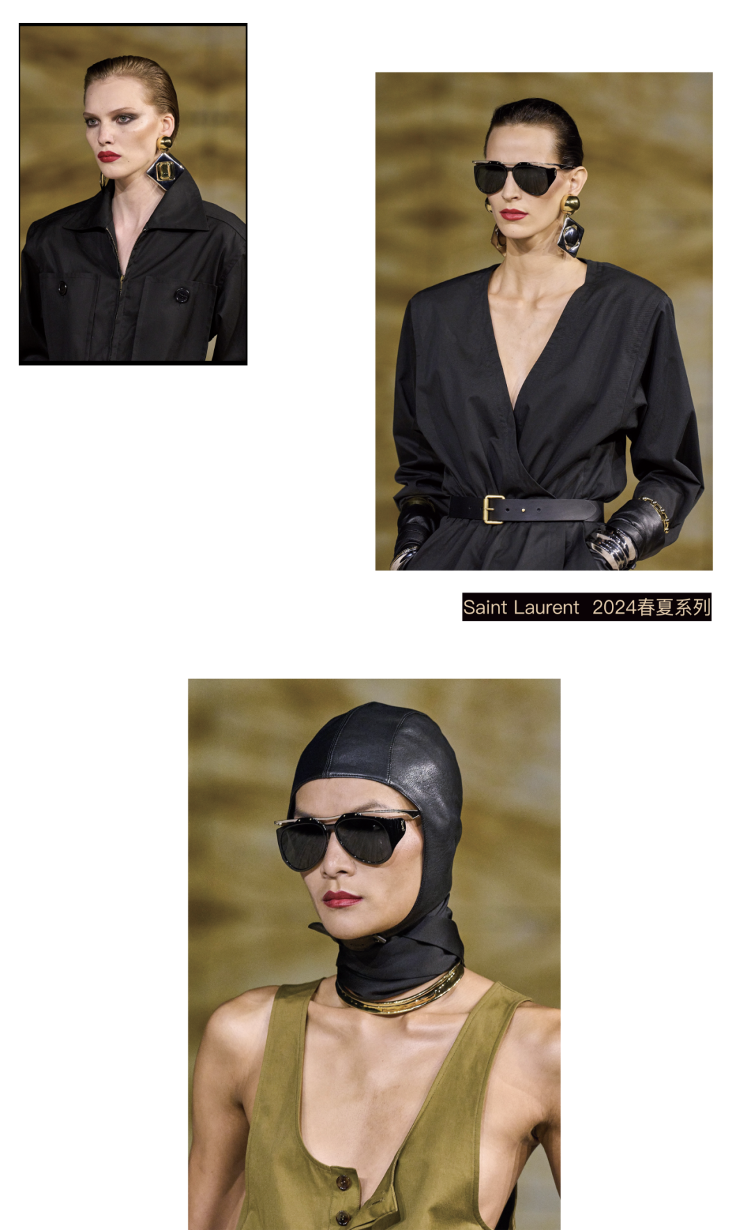 精致的穿搭,少不了点睛的配饰加持,这会在原本的服装上赋予更深层次的搭配妙语。本季相比于Saint Laurent以往的系列来说是新颖的,主要以适合日间穿着的宽松狩猎夹克、连体裤、工装服和棉质运动装等,色调也多以大地色系为主。该系列的灵感源自女性赛车手和飞行员,头盔、手套和拉链前襟的工作服配合腰带呈现利落之感,搭配焦糖色的细高跟鞋,中性兼具女性化。除这些元素以外,妆容方面,斜刘海儿、烟熏眼、红唇和厚重的手镯、眼镜、耳环等配饰,为每套造型更添姿彩。