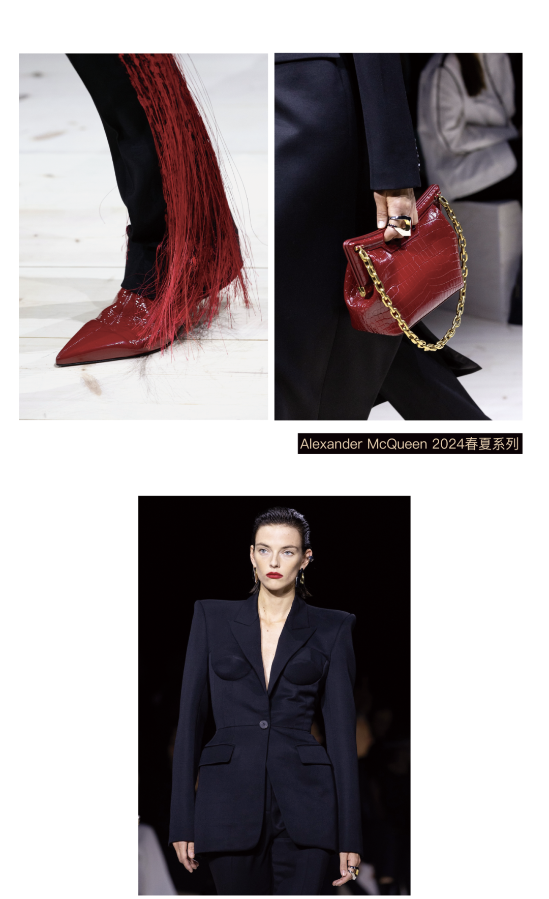 Alexander McQueen 2024春夏成衣系列同样给人带来了惊喜,品牌经典的皮革、羽毛等元素也在这一季得到了全新演绎,既保留了品牌一贯的叛逆不羁,又充满了时代气息。在配饰方面,同样精彩纷呈。设计师们巧妙运用珍珠、宝石、金属等材质,打造了一系列独具匠心的饰品。无论是经典的腰带、手拿包,还是充满创意的鞋子、帽子,都使整个系列更为增色。