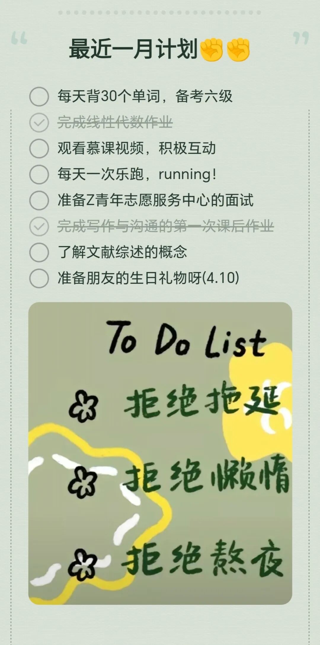 “这个学期不再为拖延找借口,确保每天完成当天计划的任务,包括课程作业、项目和学习任务!”