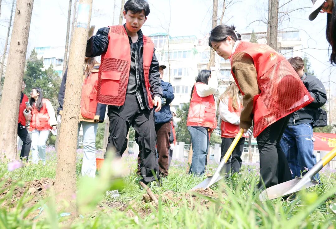 活动现场,老师和同学们互帮互助,为北水杉林和时间广场添砌绿色的底色。水杉树和二月兰在阳光的照射下显得格外婀娜多姿,老师和同学们有的扶树有的填土,一片热情地投入到植树的行列中,随着树苗埋入土壤,校园增添了一抹生机勃勃的景象。