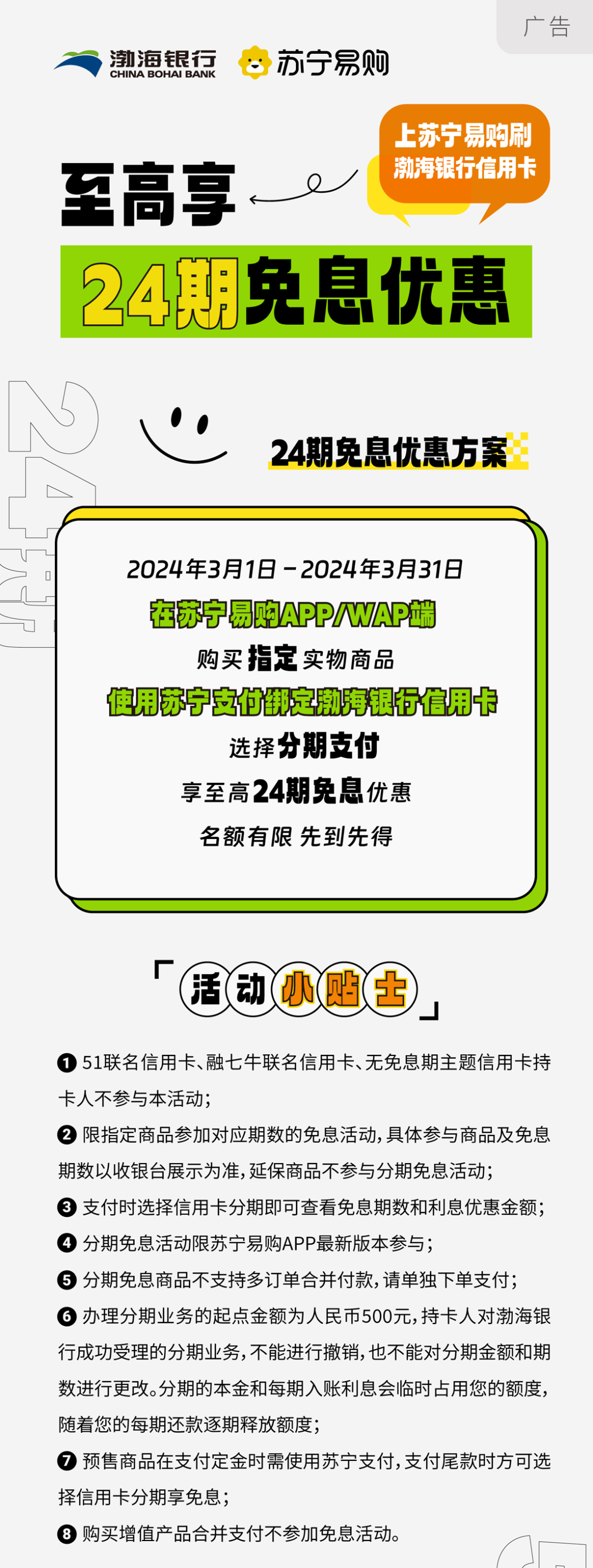 摘要:上苏宁易购刷渤海银行信用卡,享至高24期免息优惠!