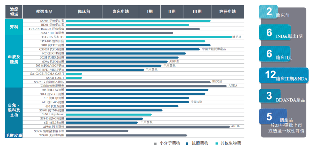公告显示,三生制药研发管线拥有29项在研产品,包含血液/肿瘤科13项,自身免疫及眼科11项,肾科4项,皮肤科领域1项。截至目前,已有12款新药推进至临床III期或NDA申报阶段,3款仿制药品种处于BE及ANDA申报的阶段。