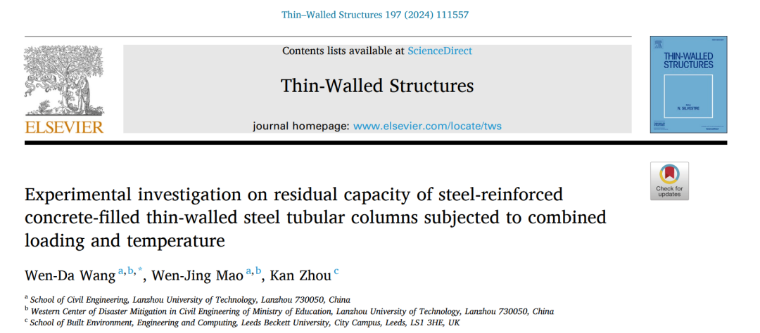 近日,学校土木工程学院“钢与混凝土组合结构混合结构团队”在内配型钢的钢管混凝土组合结构抗火性能研究中取得一系列研究进展,并以题为“Experimental investigation on residual capacity of steel-reinforced concrete-filled thin-walled steel tubular columns subjected to combined loading and temperature”发表在工程技术领域Top期刊《Thin-Walled Structures》(中科院一区,IF: 6.4)。土木工程学院“钢与混凝土组合结构混合结构团队”负责人王文达教授为第一作者,青年教师毛文婧博士为第二作者。兰州理工大学为第一署名单位,英国利兹贝克特大学为合作单位。