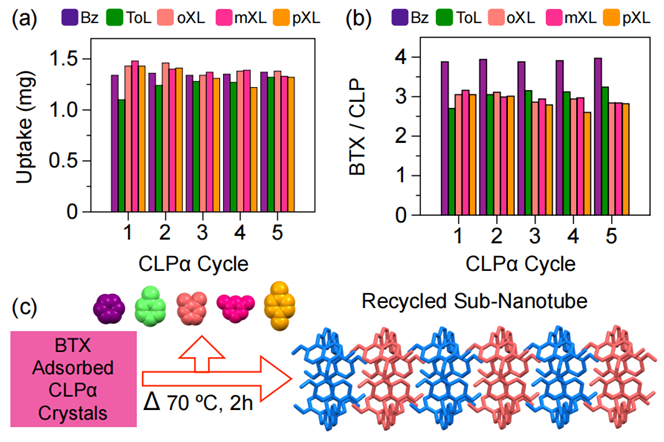 团队设计合成了一种新型超分子大环芳烃:卡环芳烃(Clamparene,简称CLP)(图1),并制备了基于卡环芳烃的晶态多孔材料CLPα。通过N2气体吸附−脱附实验,确定了CLPα晶态材料的稳定性和多孔性。考虑到CLP较大尺寸空腔和晶态固体CLPα的多孔性,团队研究了CLPα晶态材料对苯系污染物BTX(苯、甲苯、邻二甲苯、间二甲苯、对二甲苯)的吸附性能。研究表明,CLPα晶态材料对苯系污染表现出了良好的吸附性能,具有吸附速率快、负载量高以及可循环利用性能好的特点(图2)。团队进一步利用X-射线单晶衍射实验证实了CLPα晶态材料对苯系污染物(BTX)的吸附机理,实验表明,BTX分子通过C-H···π相互作用被吸附于CLP自组装形成的亚纳米管结构中,其中三个BTX分子通过C-H···π相互作用被封装在一个CLP分子空腔之中(图3)。