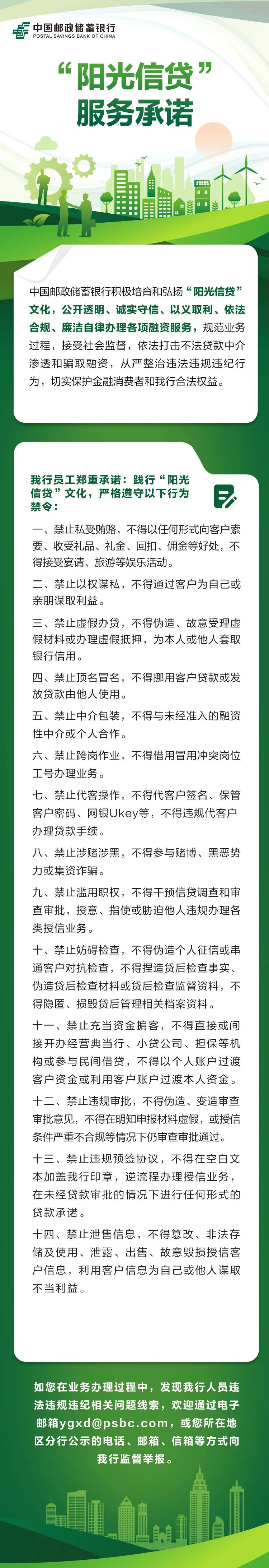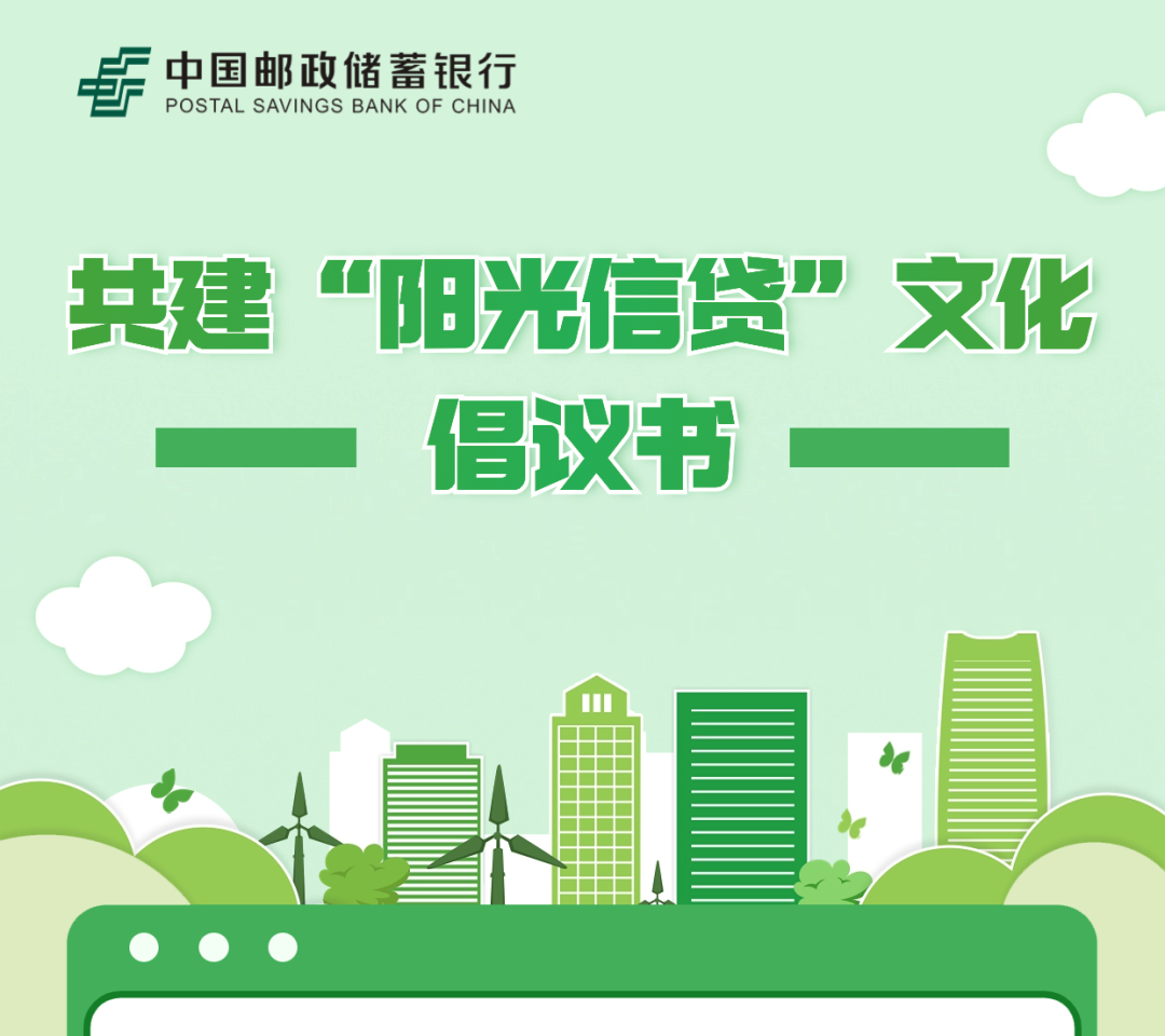 为积极培育中国特色金融文化,维护金融消费者合法权益,中国邮政储蓄银行启动“2024阳光信贷年”活动,着力打造“公开透明、诚实守信、以义取利、依法合规、廉洁自律、有效监督、严格惩治”的“阳光信贷”文化。为此,特向广大金融消费者发出如下倡议,感谢您协助我行共建“阳光信贷”文化。