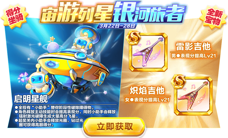 1、活动期间,完成指定任务即可选择获得银河旅者礼包、自选币、炽焰吉他、雷影吉他、启明星舰;还有超多七彩石和传说徽章等你拿哦~