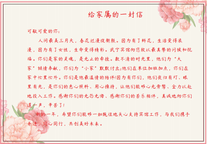 俗话说:成功男人的背后都有个伟大的女人。宾馆的每一步成长,离不开家庭后盾的鼓励和扶助。因为有她们,我们才能够心无旁骛,全身心投入工作。在佳节来临之际,给男人背后的女神送上一束鲜花,感谢她们无怨无悔的付出。也希望能够一如即往地关心支持宾馆工作,与我们携手并进,同心同行,共创美好未来。