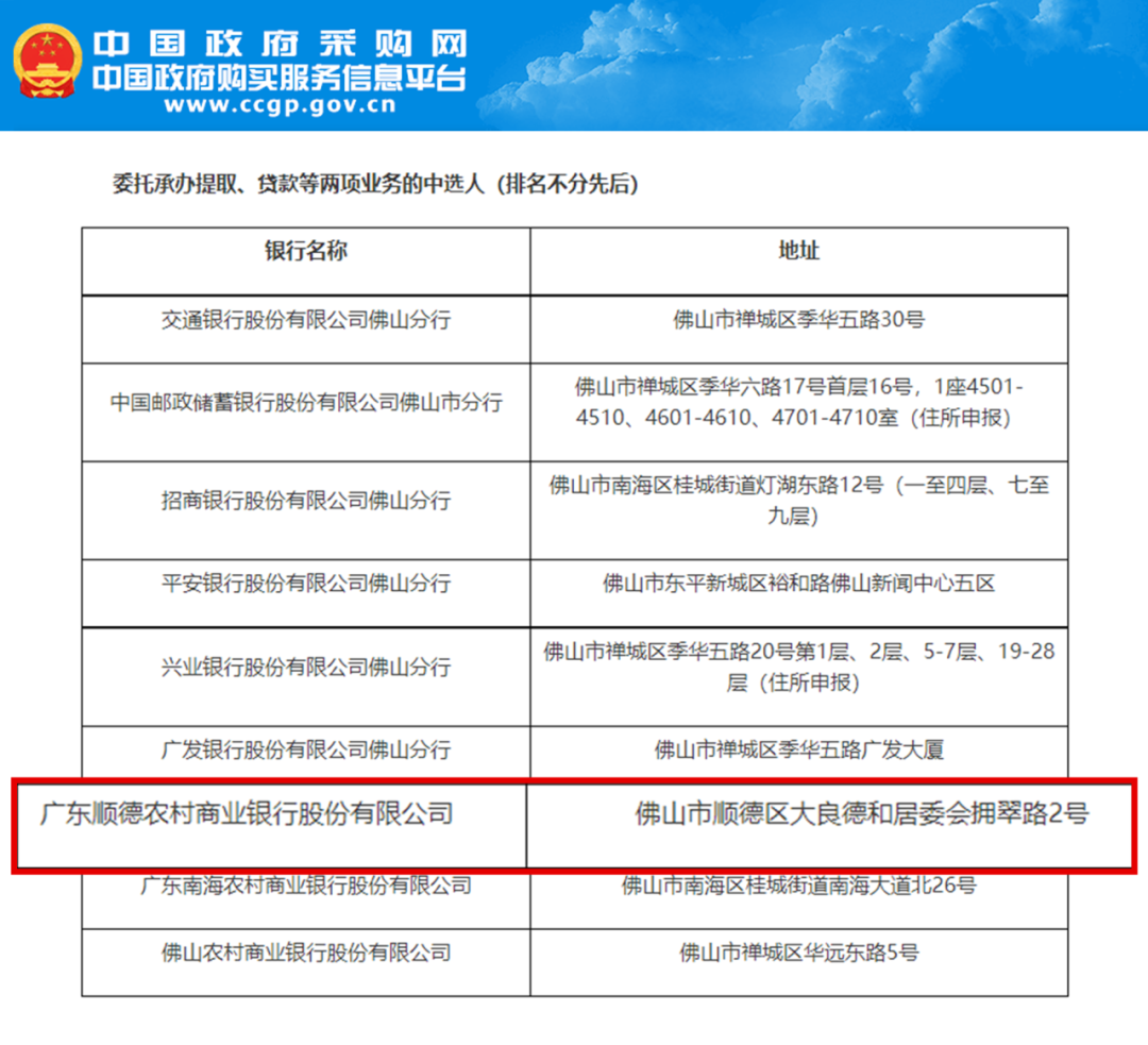 3月22日,中国政府采购网发布公告,公布在佛山市竞争性选择住房公积金业务受委托银行项目比选中,顺德农商银行顺利通过评审,中选佛山市住房公积金提取、贷款业务受委托银行,可以受理佛山市全市五区的公积金贷款和提取业务,服务范围更广。这是对我行服务的肯定,也是我行在住房公积金业务领域的又一次重要突破。