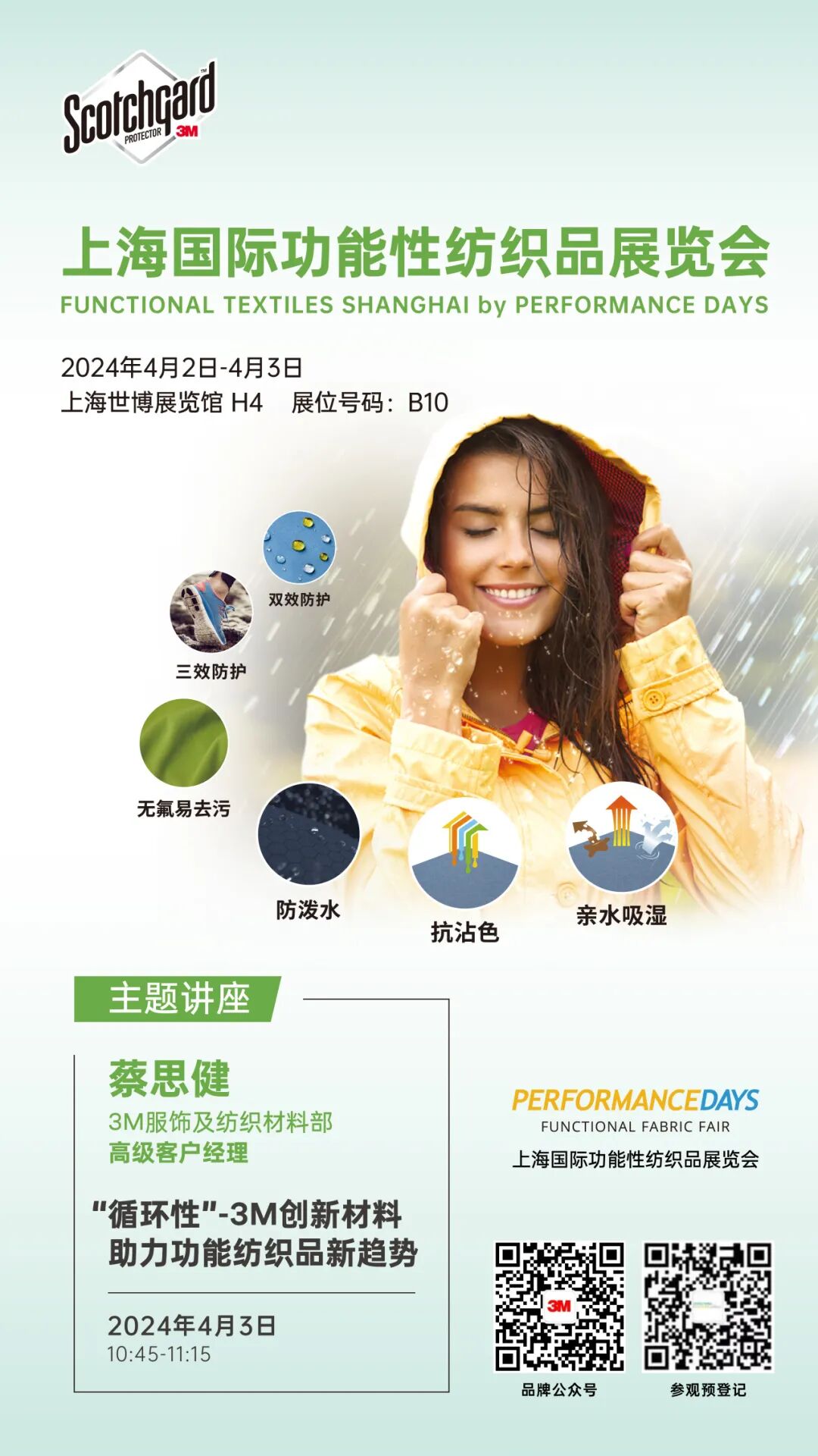 展会期间,3M消费品事业部服饰及纺织材料部 高级客户经理 蔡思健先生将于4月3日10:45-11:15受邀分享一场 《“循环性"-3M创新材料助力功能纺织品新趋势》的主题演讲,以可持续发展为引领,共探循环时尚的系统创新方案。