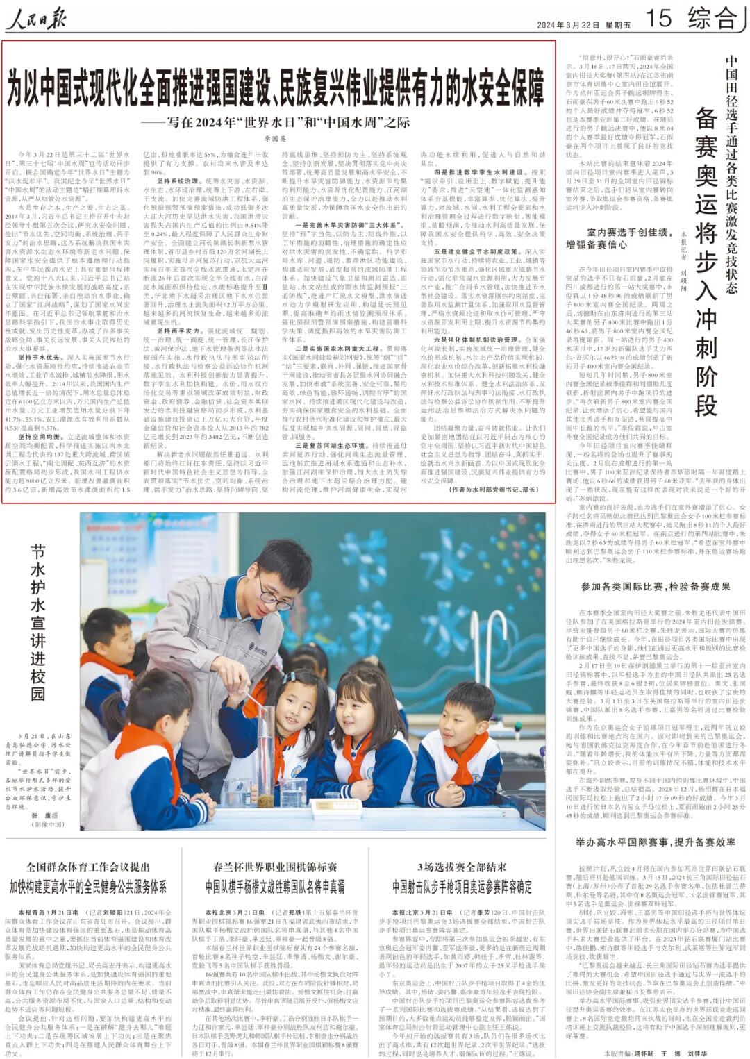 水是生存之本、生产之要、生态之基。2014年3月,习近平总书记主持召开中央财经领导小组第五次会议,研究水安全问题,提出“节水优先、空间均衡、系统治理、两手发力”的治水思路,这为系统解决我国水灾害水资源水生态水环境等新老水问题、保障国家水安全提供了根本遵循和行动指南,在中华民族治水史上具有重要里程碑意义。党的十八大以来,习近平总书记站在实现中华民族永续发展的战略高度,亲自擘画、亲自部署、亲自推动治水事业,确立了国家“江河战略”,谋划了国家水网宏伟蓝图。在习近平总书记领航掌舵和治水思路科学指引下,我国治水事业取得历史性成就、发生历史性变革,办成了许多事关战略全局、事关长远发展、事关人民福祉的治水大事要事。
