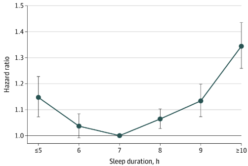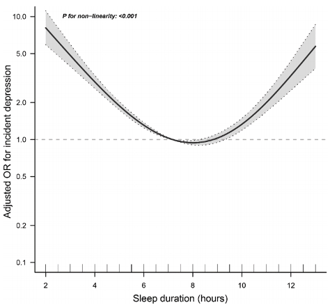 睡眠时长为7小时的人群全因死亡率最低,睡眠时长过短或过长对健康都有潜在的不利影响。对抑郁症的研究也发现睡眠时长和抑郁症患病风险之间呈现U型关联。