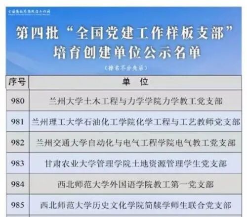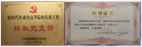党建工作质量持续提升,示范带动作用明显。以标准化支部建设为重点,在党建示范创建和质量创优工作中,支部入选新时代甘肃省高等院校党建工作“样板党支部”。支部书记入选新时代甘肃省高等院校党建工作优秀教师党支部书记“双带头人”,获得学校“师德标兵”“教学名师”等称号。以党员教师为主体,获全国高校化工原理教学能力大赛一等奖1项、全国高校化工类课程思政三等奖2项,入选甘肃省领军人才2人,飞天学者特聘教授2人,省研究生教育优秀导师2人,省级创新团队2个,省基础研究创新群体1个,省级教学团队1个,省级一流课程2门。