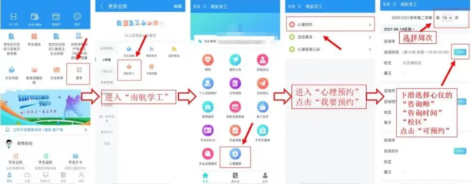 打开“i·南航”APP--进入“南航学工”--选择“心理健康”板块--选择“心理预约”服务--点击“我要预约”--选择合适的周次、咨询师、咨询时间、校区,点击“可预约”进行预约(详见下图)。