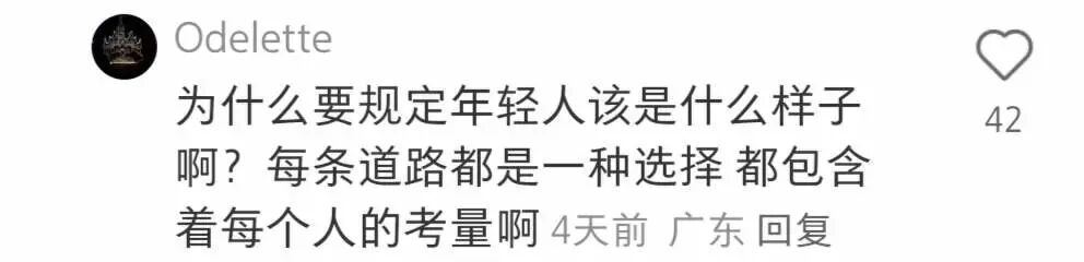 不过,当有人感慨“这才是年轻人该有的样子”时,小红薯@Odelette 大胆开麦:为什么规定年轻人该是什么样子呢?每条道路都是一种选择,都包含着每个人的考量。