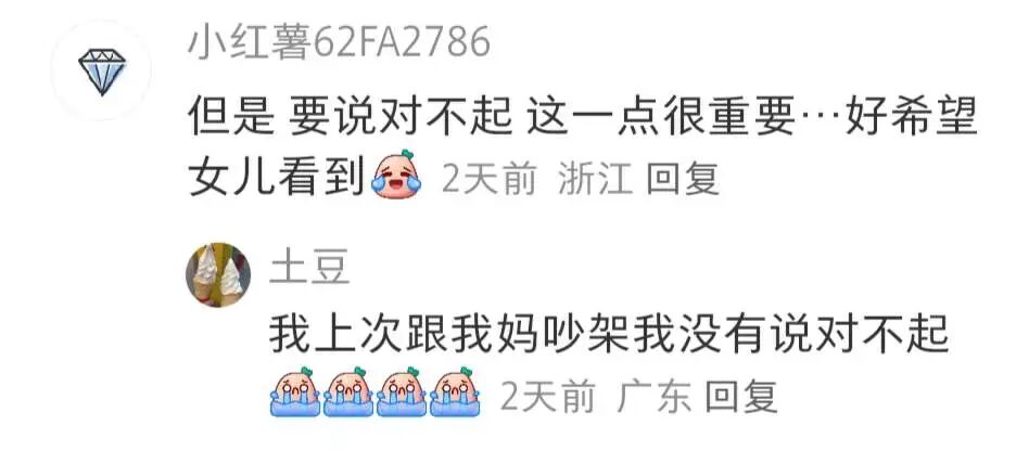 恩利“吵完架之后要记得说对不起”的提醒,让@土豆 颇有些自责地反思自己对妈妈的态度。