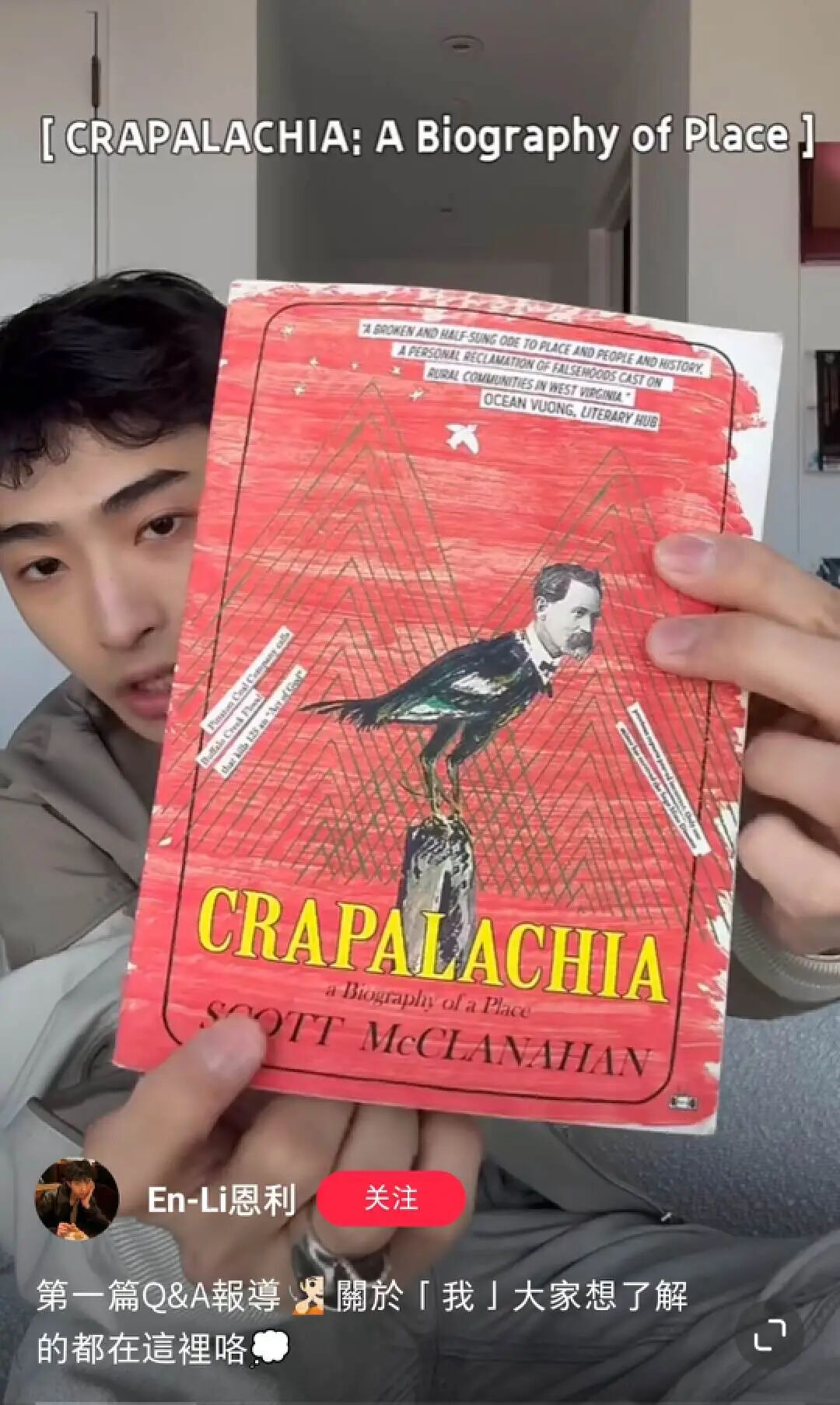 会用读书保持对生命的探索和好奇的@En—Li恩利 ,向小红薯们推荐了最近在读的一本英文书《CRAPALACHIA:A Biography of Place》。读到自己喜欢的句子时,他动容地用“震撼,眼泪直流”表达自己的感受。