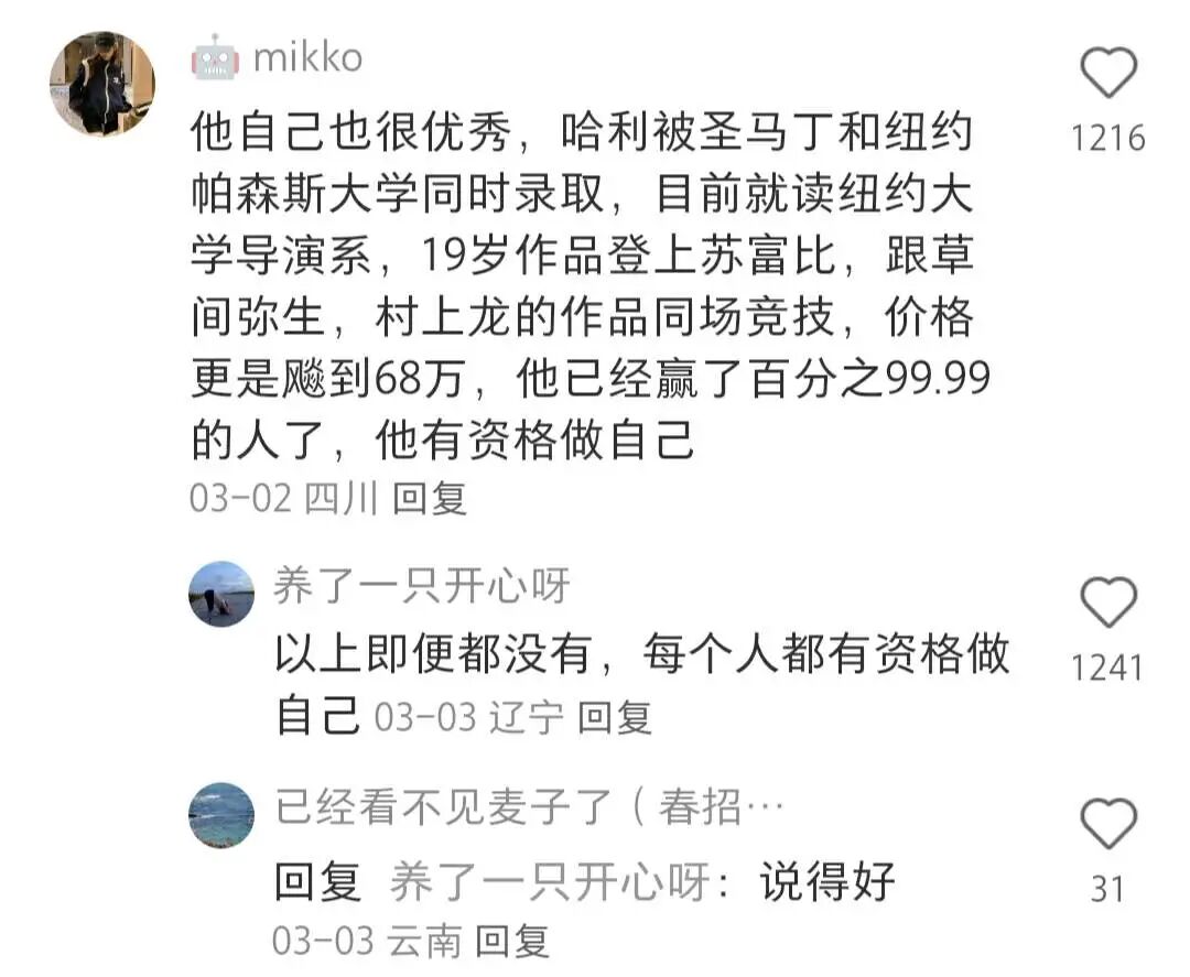 有人盛赞他是天生的艺术家,有人开始向往尊重个人意志的家庭,自然也有幽幽自怜的声音:“有钱有爱的星二代,当然可以活得这么自由。”