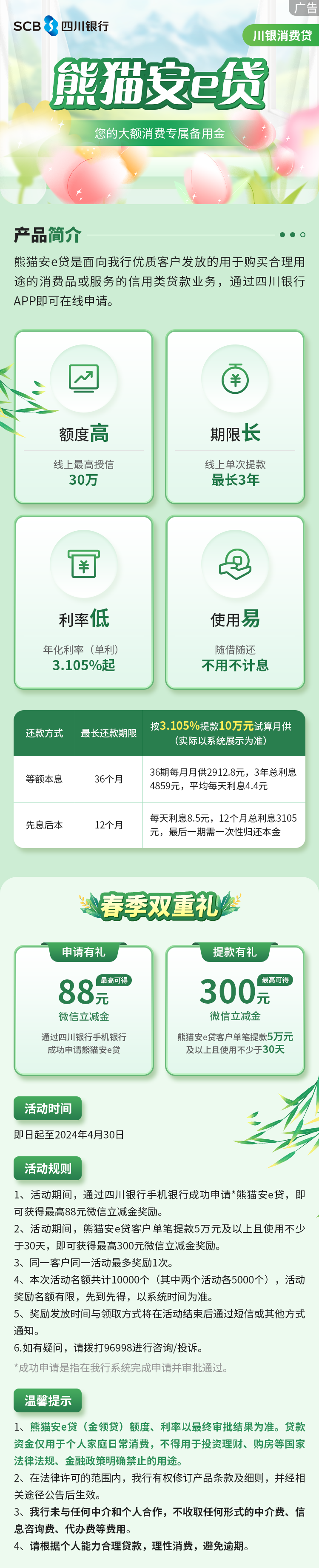 【贷款有礼】熊猫安e贷春季双重礼,最高可得300元微信立减金!