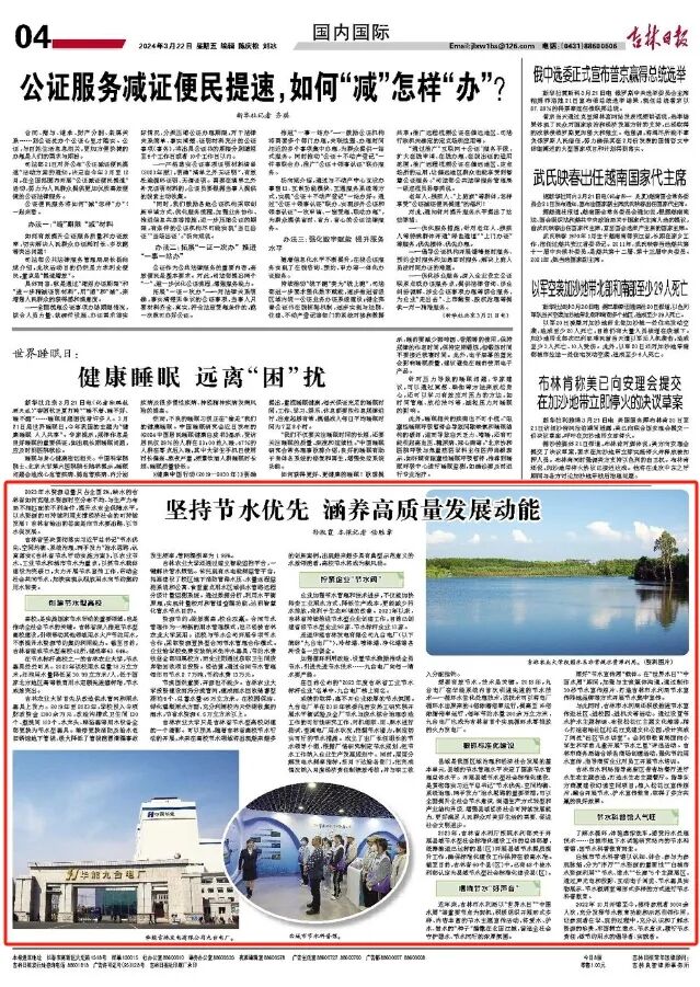 2024年3月22日,时值第三十二届“世界水日”,第三十七届“中国水周”之际,中国水利报、消费日报、吉林日报、吉林广播电视台、吉林水事等多家媒体先后宣传报道我校节水先进事迹。