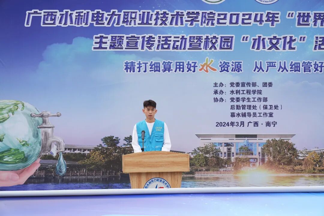 随后,节水宣传员代表23水文班覃琪翔同学向全校发起倡议,倡议全校师生树立节水意识,节约用水,减少浪费,为建设美丽、绿色的校园环境贡献一份力量。