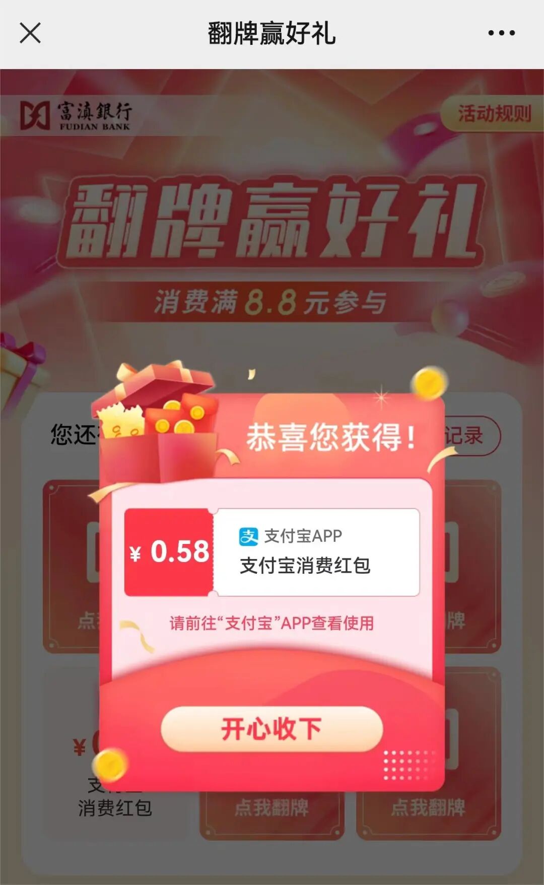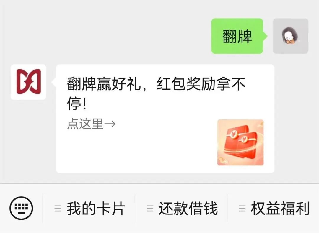 关注并绑定富滇银行信用卡微信公众号,每日全渠道信用卡支付满8.8元(含),可在微信公众号回复“翻牌”参与翻牌赢好礼活动。而且每天可翻三次!!!