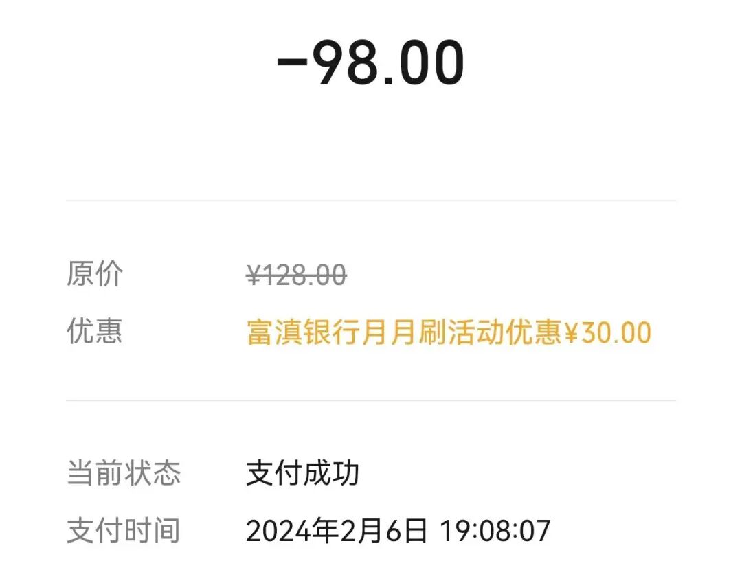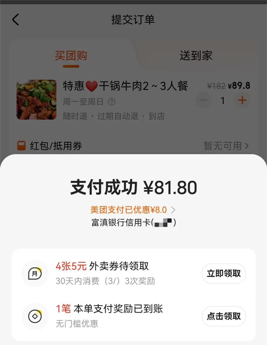 吃午饭和点下午茶,又可以激活信用卡美团福利——美团APP使用富滇银行信用卡支付满28元立减8元。