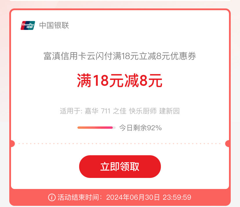 线下消费,在指定店铺使用信用卡绑定云闪付支付,又可以享受满18元减8元福利。
