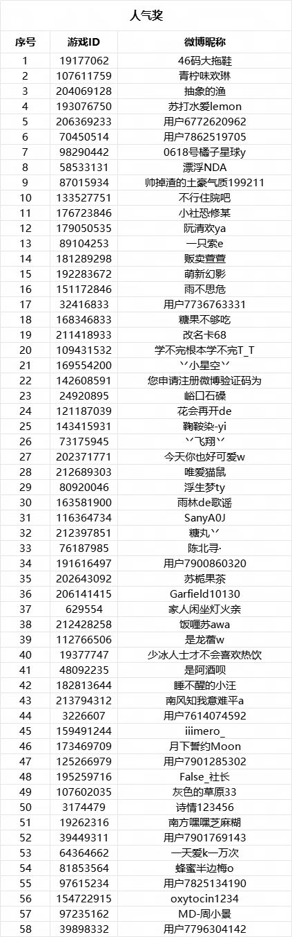 恭喜以下小伙伴获得人气奖,将领取到2024皮肤染色分享活动人气礼物和星星*1的奖励!奖励在准备完毕后,通过游戏邮箱发送,请小伙伴们耐心等待~