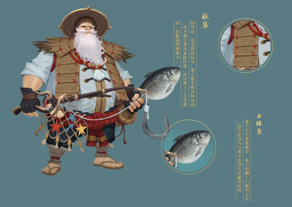 我们让董卓一改往日霸气黑暗的风格,选择了简朴自然的乡村风格,将他打扮成了一介渔夫,配合一脸横肉的凶相,是不是有一种暴躁老头的反差感呢?