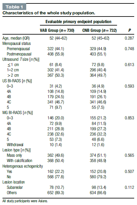 共纳入1470名超声下可见的、需要进行乳房组织活检的乳腺病变患者(年龄大于18岁),并以1:1的比例随机分组,接受VAB或CNB。所有患者在穿刺活检后均行手术切除。