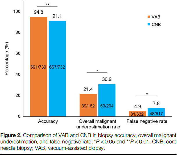而两种设备在术后非恶性病变方面无显著差异,VAB和CNB: 100.0%(98/98)和98.3% (113/115),P=0.501]。