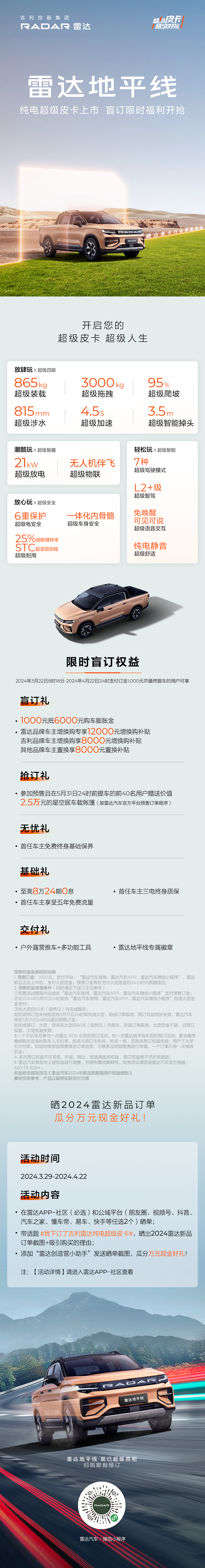 1.上述权益提供方为【雷达汽车销售(山东)有限公司】,其中基础礼“8万24期0息“贷款产品由吉致汽车金融提供;2.“8万24期0息”贷款产品是指贷款金额为8万元,贷款期限为24期时,贷款年化利率为0%,利率采用单利计算方式;3.详细融资方案详细可询4008-377-088,并以最终签订的合同为准。