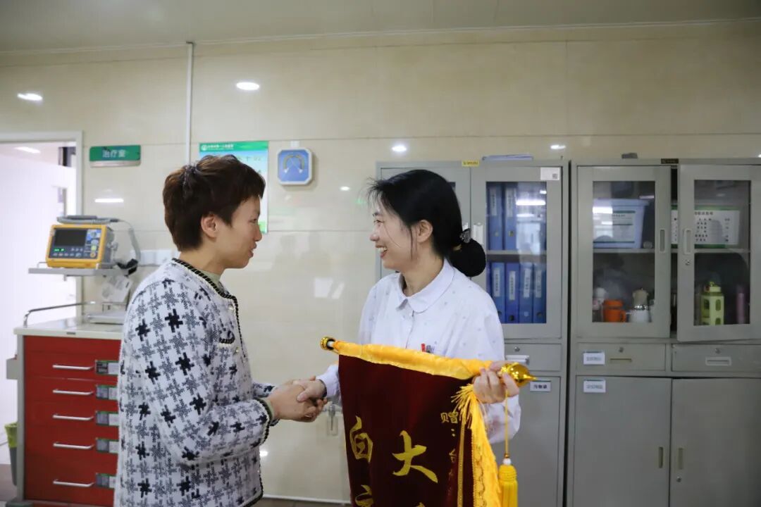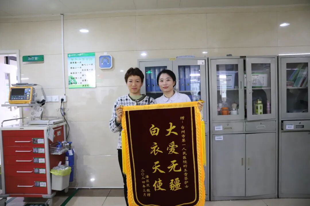 据了解,被救助的女士姓潘,此次是出差回程,她一直有恐高,飞机上出现的窒息感,让她特别的恐惧和无助。有医生在身边,握住自己的手,安慰自己,让她很安全,这才缓解了状态。她一定要找到这位救人的天使,好好的感谢她。潘女士当时状态很差,隐约听到救人的医生说,是台州市第一人民医院的。经过全院寻找,发现救人的天使是全科医学科的王雪芬护士。今天潘女士专程将一面“大爱无疆、白衣天使”的锦旗送到了王雪芬手里,不停地说:“谢谢,谢谢!”