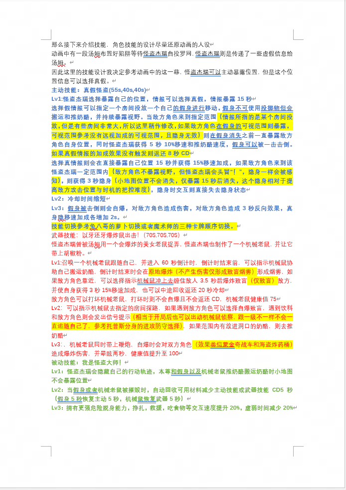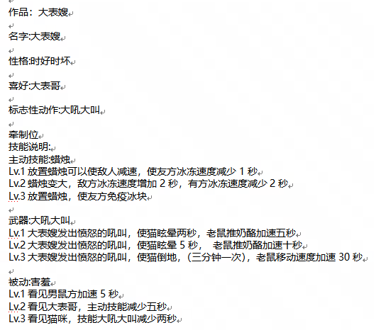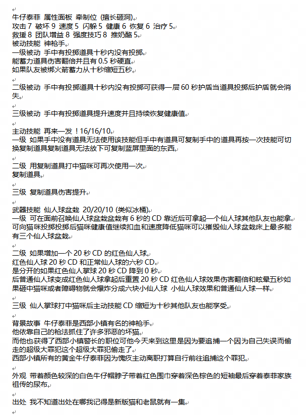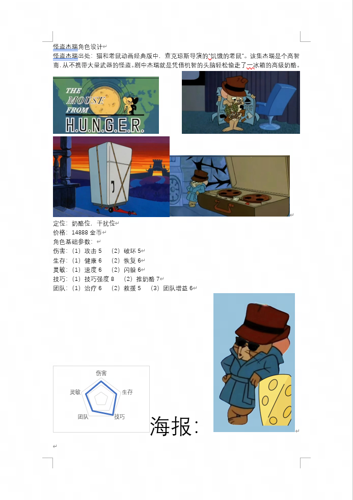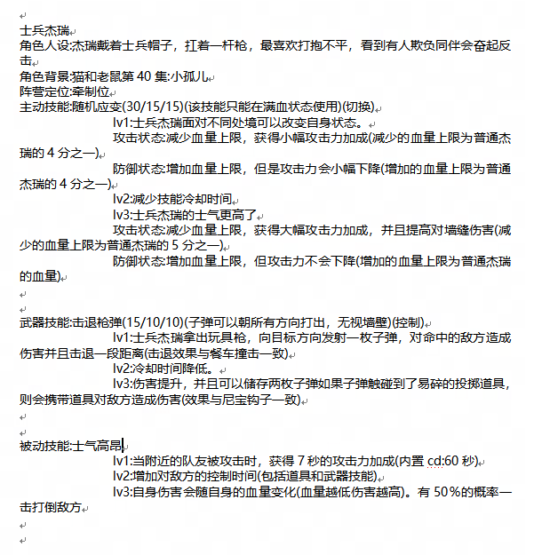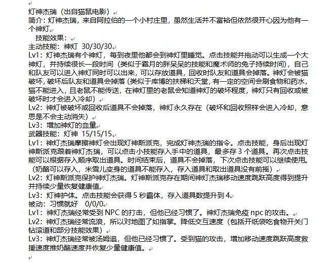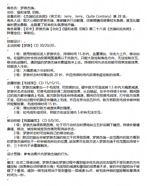 评语:角色的背景故事非常有趣,与猫和老鼠的世界观紧密相连,增添了游戏的故事性。角色技能设计合理,具有较高的实现性。