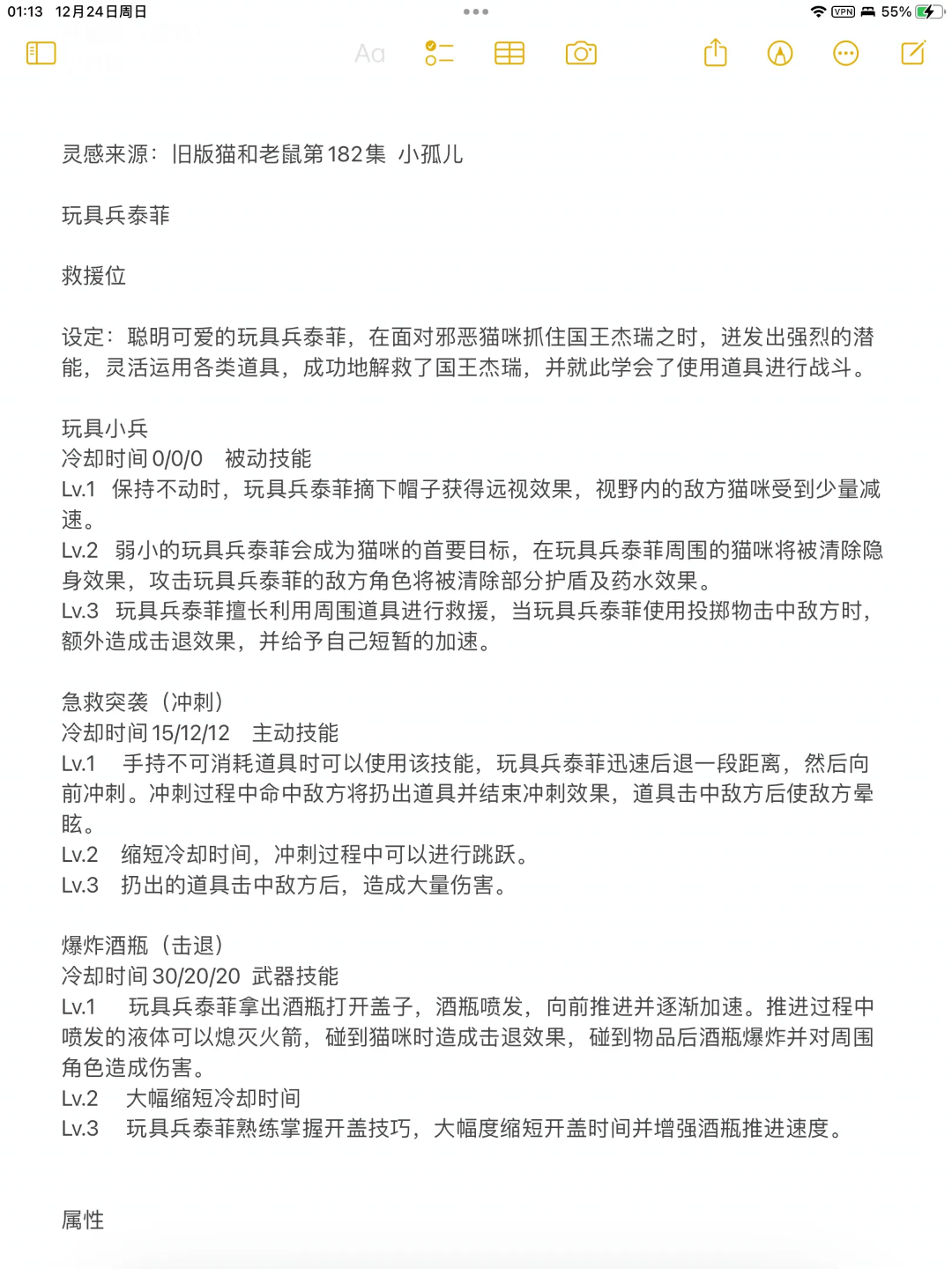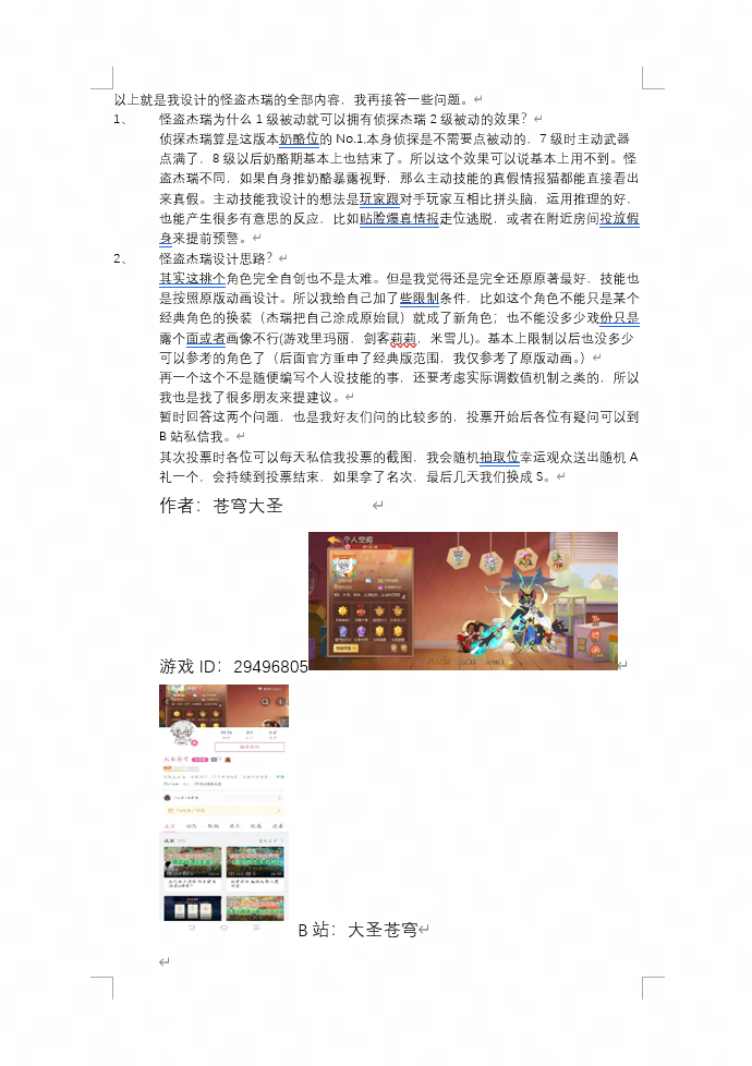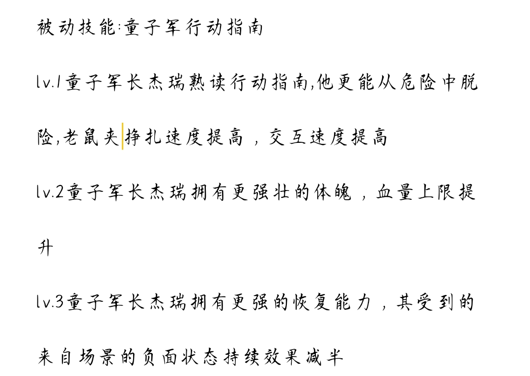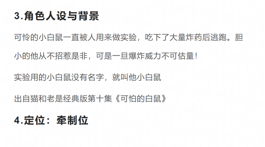 评语:角色的背景故事非常有趣,与猫和老鼠的世界观紧密相连,增添了游戏的故事性。角色技能设计合理,具有较高的实现性。