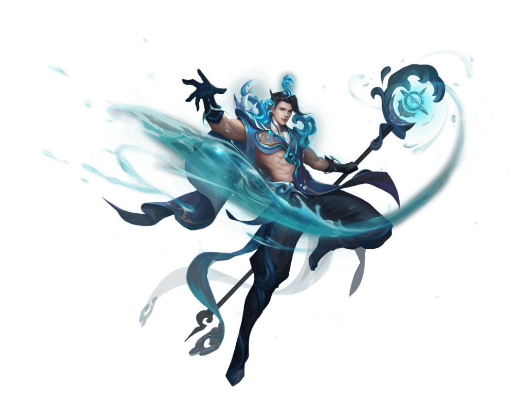 本次梦*庞统化身为一位乘着风帆与浪涛弄潮儿,服装设计突破了常规的国风剪裁设计,为人物增添了飘逸不羁的气质。色调以深蓝为主,前襟勾勒青色衣边,衣摆上实下虚打造水流效果,整体设计层次分明。