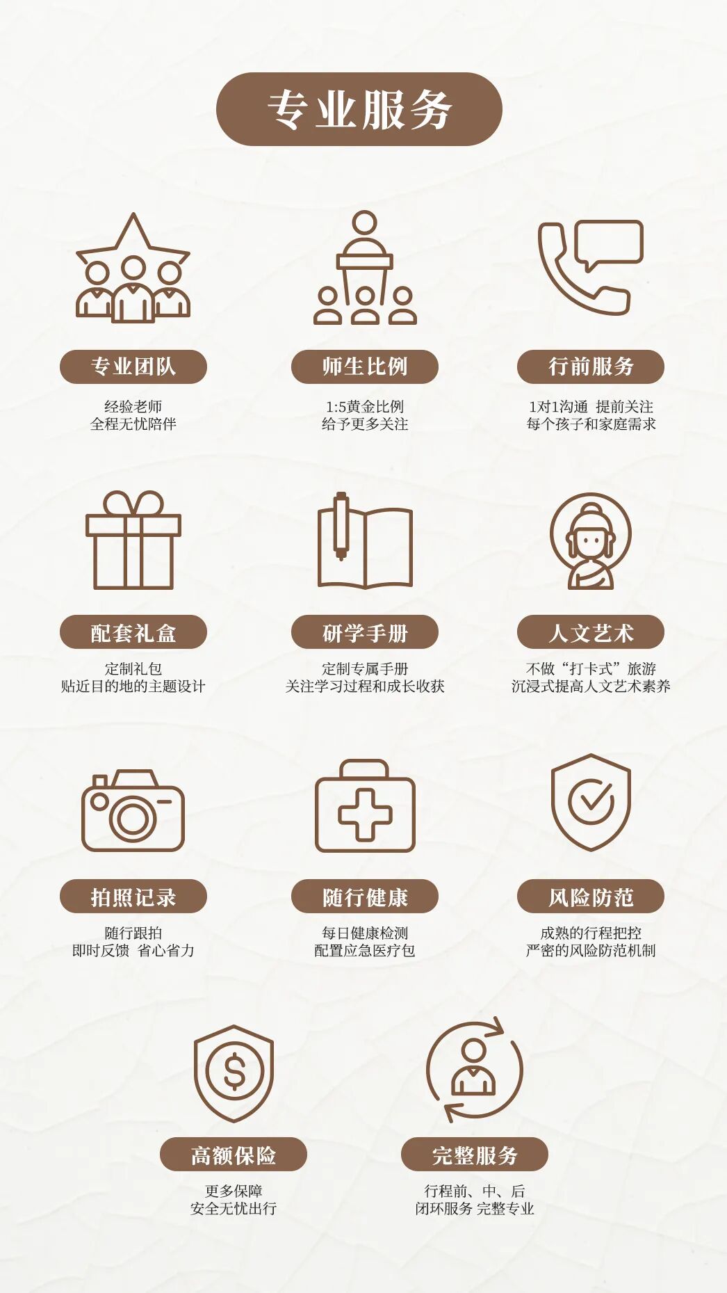 本次行程将全程提供专家讲解团队服务。不仅有历史文化艺术的输出,而且更加注重孩子们的实操体验感受,在过程中让孩子们变身小小考古艺术家和手作匠人,带着探索学习、实操揭秘、学习收获的视角去真正认识和了解这座神秘古老而又现代化的城市。