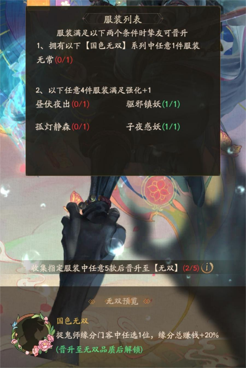 8、挚友皮肤与无双挚友:前期不需要可以获取太多挚友皮肤,等国色无双活动(主要是捉鬼、猫女)获取皮肤。无双挚友分成三类: