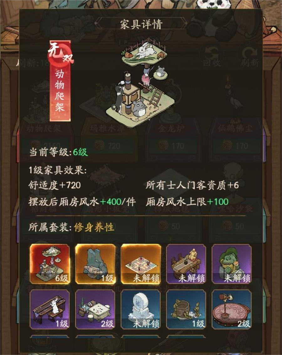 ④家具:厢房的家具按职业增加对应资质和百分比,这个主要获取增加士队资质的无双和传奇家具就可以了。