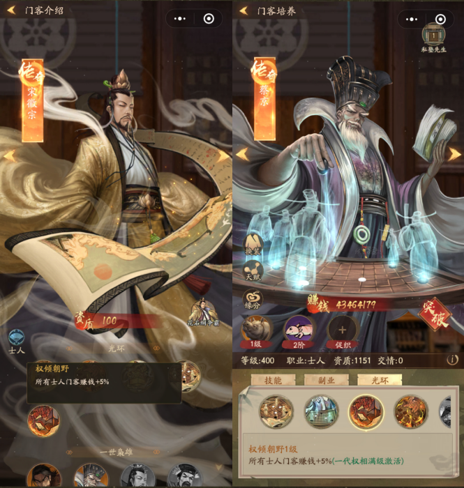 都有枭雄光环,蔡京是两免费挚友关联马姐,徽宗是韩立关联门客,一免费挚友,一首充送的挚友,还有一个可能需要氪金的。这俩门客和开山宗匠有点像,也是二选一,有氪度的建议副养宋皇,升宋皇的光环,升不动了再升蔡京。(秦皇如果满资质了可以给宋皇用鼎)