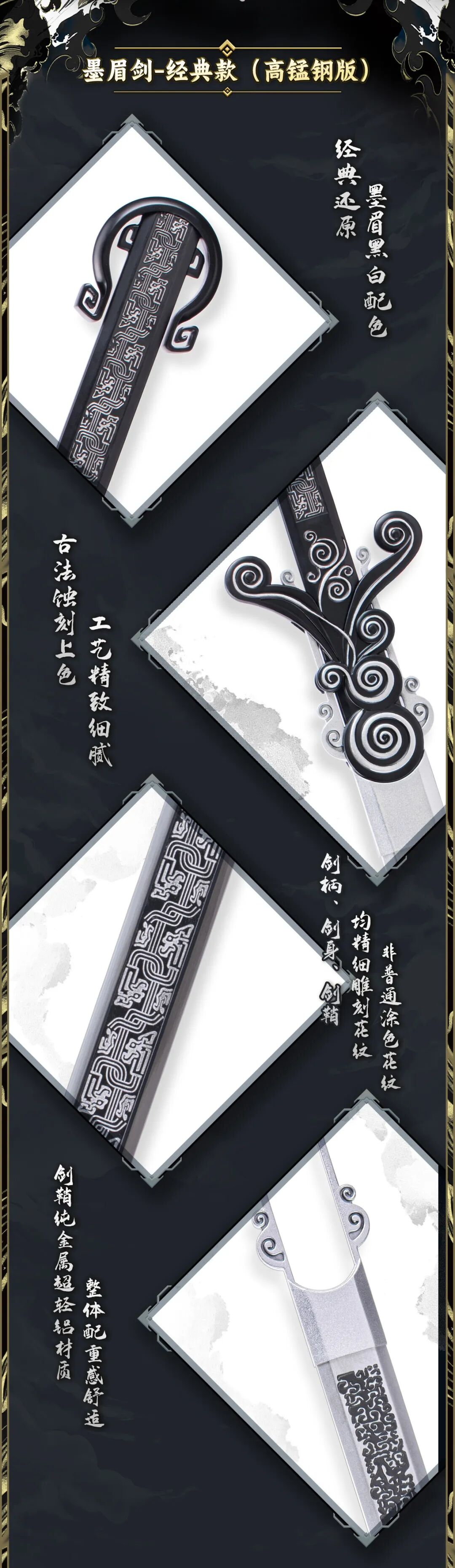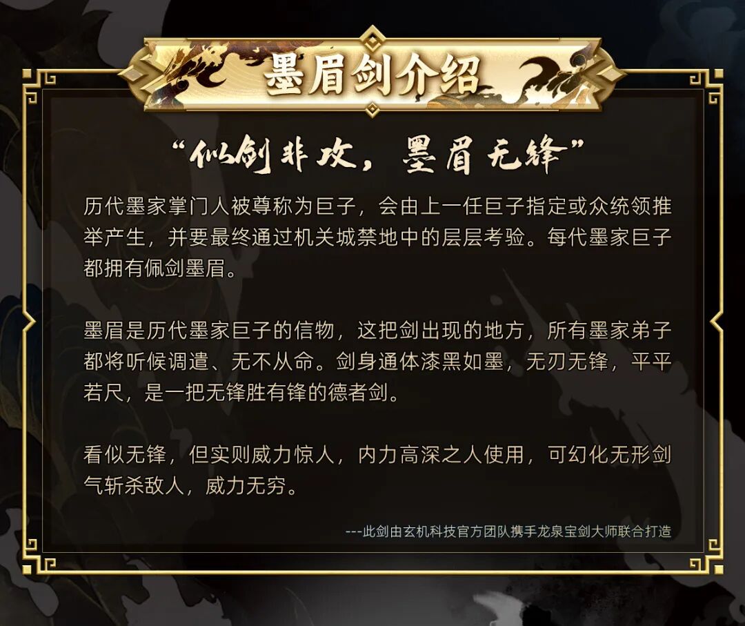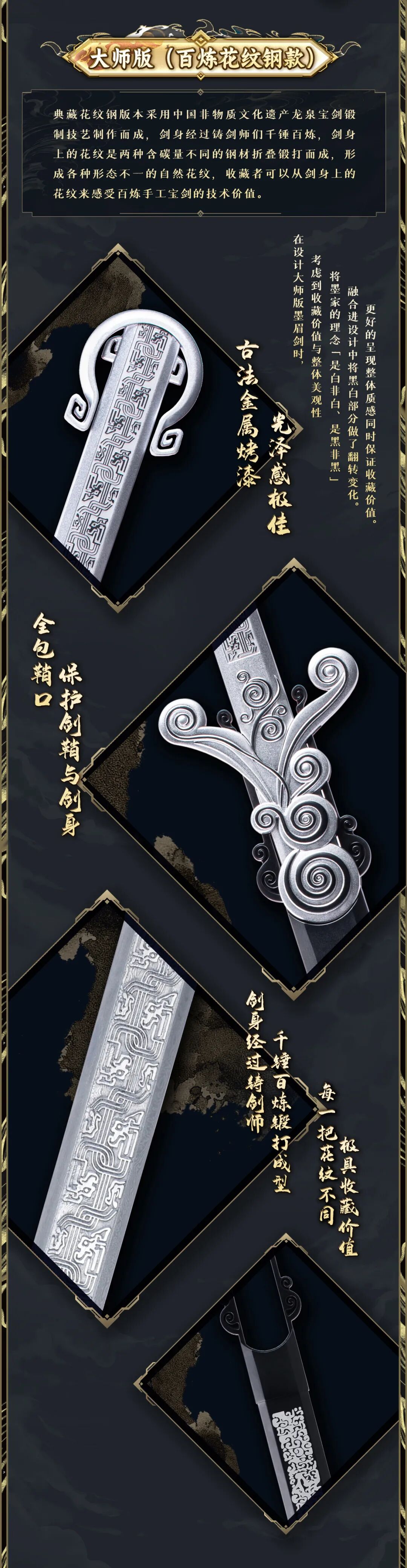 在设计大师版墨眉剑时考虑到收藏价值与整体美观性,将墨家的理念是白非白、是黑非黑,融合进设计中将黑白部分做了翻转变化。更好的呈现整体质感同时保证收藏价值。