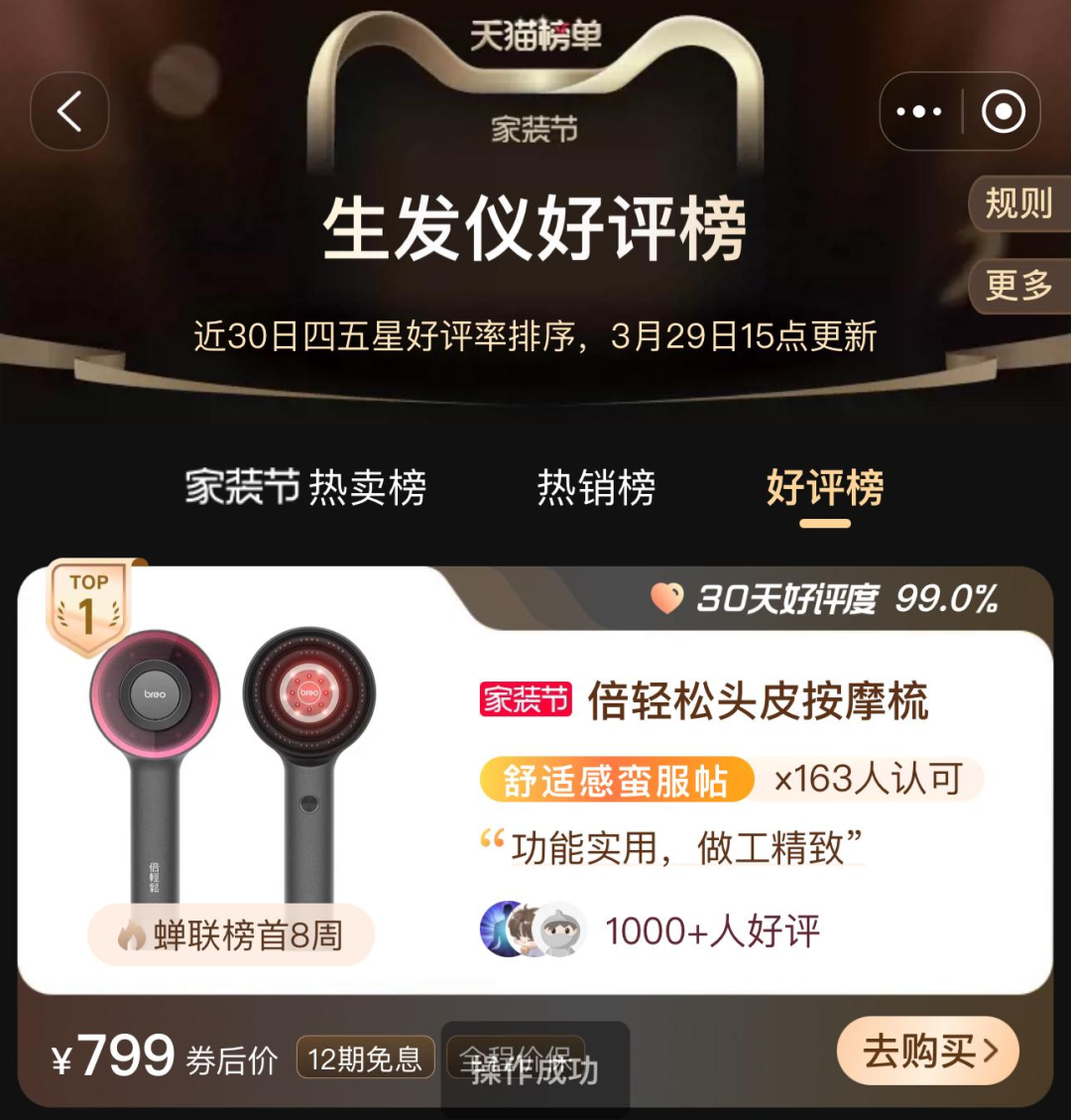 干湿两用,模拟真实按摩抓揉头皮,边按摩边导液,轻松梳出蓬松发量,一把击中当代护发人心巴,登顶生发仪天猫榜单好评榜TOP1。