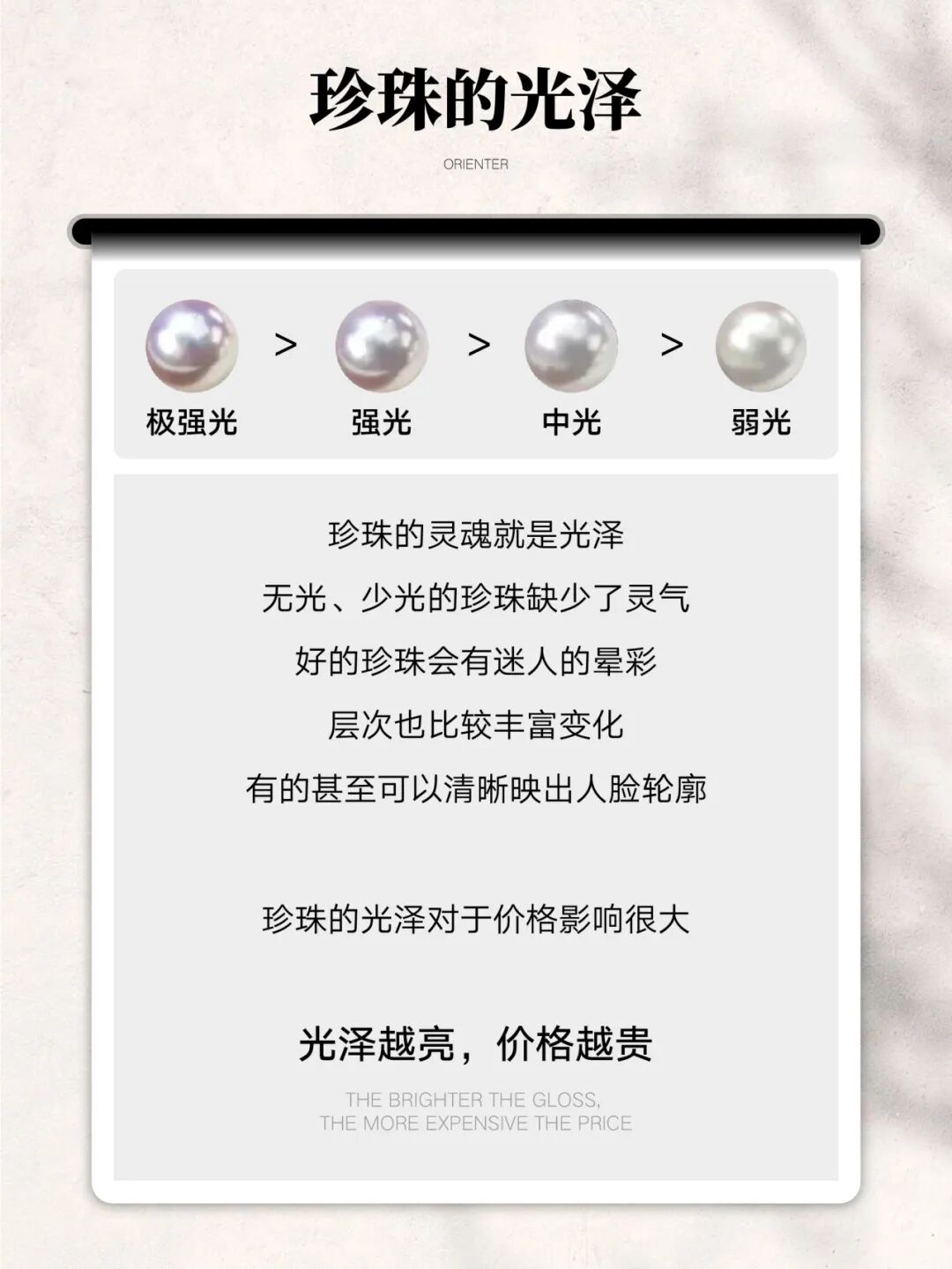 珍珠的光泽是指表面反射出的强度和映像的清晰程度。光泽越强,倒影在它里面的影像就会越清晰。