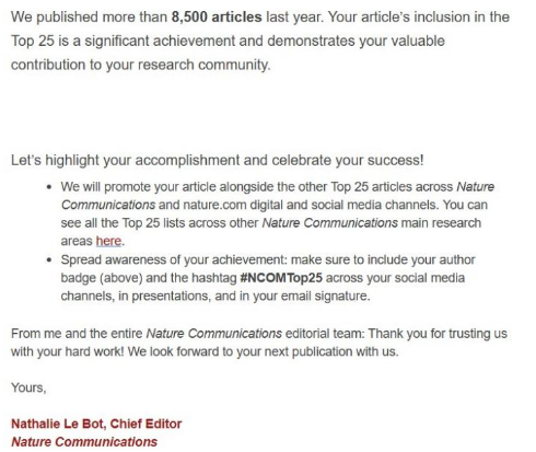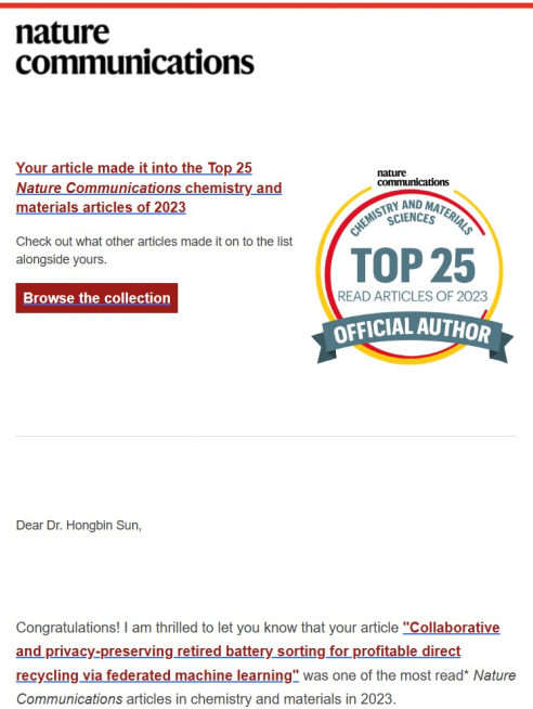近日,国际知名期刊Nature Communications(自然·通讯)主编发函祝贺我校孙宏斌教授团队发表的论文“Collaborative and privacy-preserving retired battery sorting for profitable direct recycling via federated machine learning”从8500篇论文中脱颖而出,入选Nature Communications期刊化学和材料科学(Chemistry and materials)2023年度TOP25文章,并被编辑推荐为能源领域50篇最具突破性和影响力论文(Editors' Highlights)。