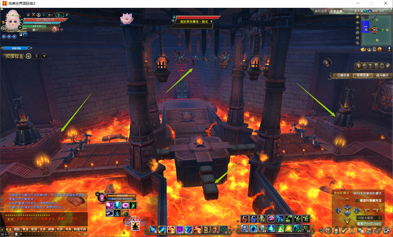 通过该区域后,就是岩魔蝠王所在地-“流火堂”。队友中远程职业要击败天空中的蝙蝠群,它们会主动攻击前进的玩家。通过会时不时消失的台阶前进到中间石台上,掉下去会直接血量清空。如图所示: